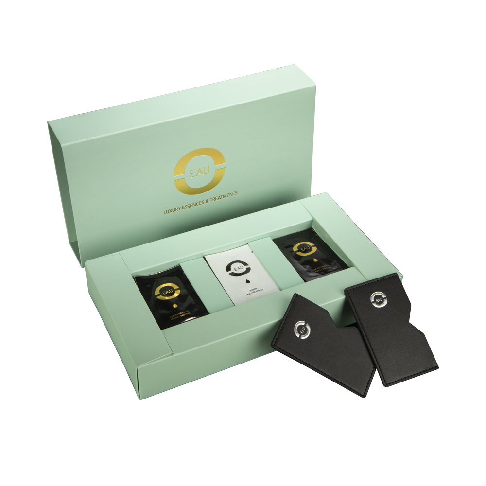 Elegante confezione regalo che richiama la struttura del “Tray” contenente 30 bustine di Hydra-sanitiser Gel, 15 bustine di Luxury Hand Treatment e 2 porta bustine “Personal O”