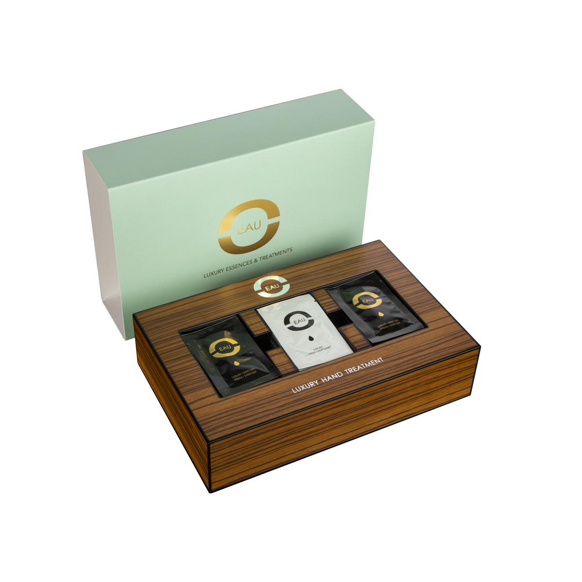 Speciale vassoio dal design minimalista disegnato per avvolgere la bustina monodose di creatività e design tipicamente Italiano. Contiene 30 bustine di Hydra-sanitiser Gel e 15 bustine di Luxury Hand Treatment.